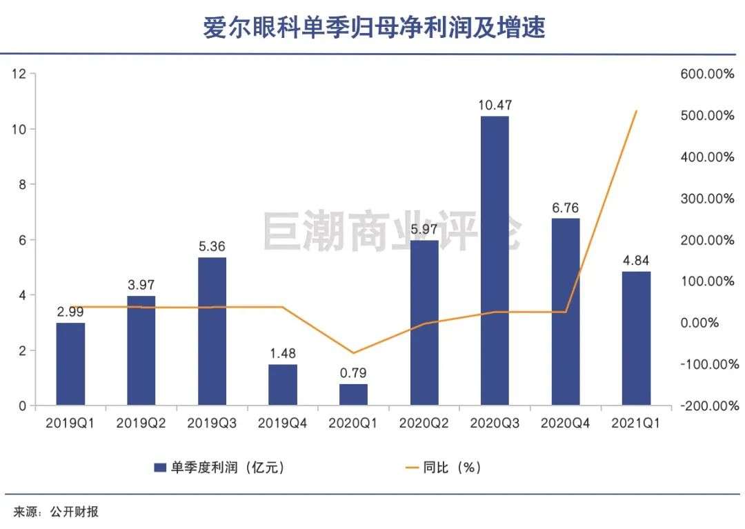 转型之后的光正眼科2019、2020年亏损逐级收窄,2021年一季度看,毛利润水平也提升到了34.31%(爱尔眼科同一时期为47.31%),可以称得上“看到曙光”,但整体规模仍然与爱尔眼科相去甚远。