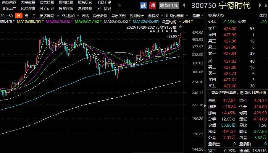 31日上午创业板指数的权重股宁德时代一度大涨5%,时隔5个月后公司股价再度刷出历史新高,这使得公司市值首次突破一万亿元,创业板也一度迎来首家万亿市值公司。