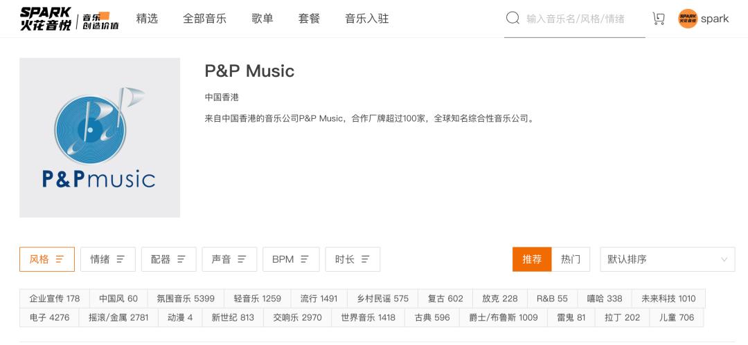 火花音悦(SparkMusic)是目前国内最大的RF商用音乐服务商,拥有超60万首全版权、定价权的曲库资源,涵盖RF、RM、RR等多种授权形式,并与海内外数百家版权方和音乐人保持联系,实时更新最新音乐作品,为客户提供极致性价比的音乐内容体验。结合独家音乐管理系统,为信息流广告、短视频、综艺制作、公播等行业上百家企业输出企业版、标准版和极速版等定制化企业级音乐商用SaaS服务。