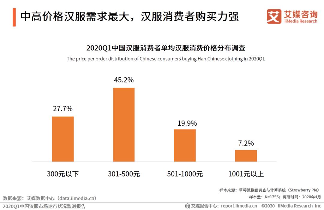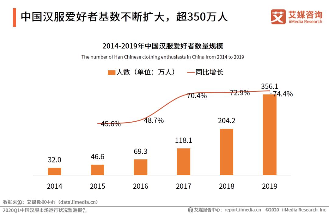 艾瑞数据报告显示《2021Q1 汉服产业报告》报告显示,2019 年中国汉服爱好者约合 350 万人,以单间汉服消费中位数 300-500 计算,2019 年汉服市场规模约合 10.5 亿-17.5 亿元左右。不足 20 亿的市场规模明显很难打动投资人。