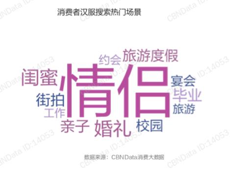 CBNDATA《2020 线上汉服消费洞察报告》显示,2020 年消费者汉服搜索的热门场景中,婚礼、街拍、度假旅游等场景频率较高。