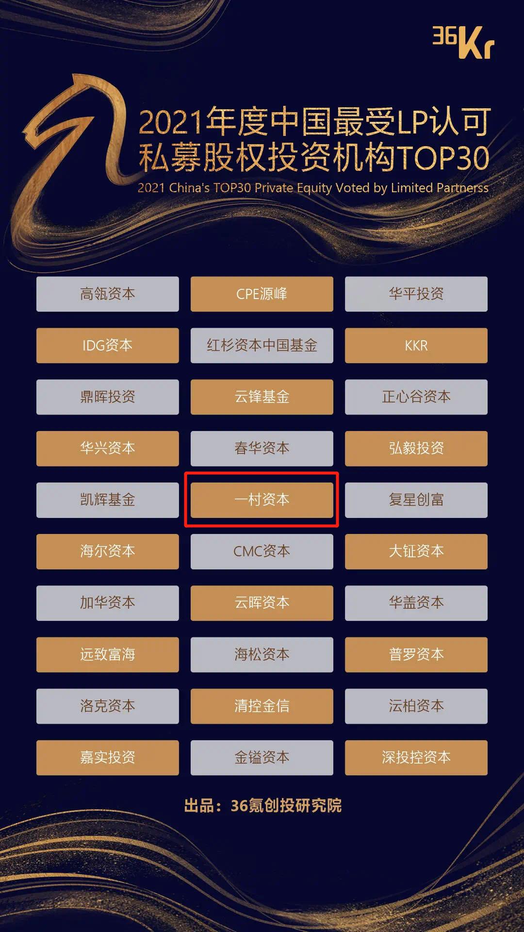 5月11日,36氪在深圳举办“2021中国基金合伙人未来峰会”,中国最受LP认可白马、黑马投资机构暨最受GP关注母基金系列榜单重磅发布,一村资本再获「2021年度中国最受LP认可私募股权投资机构TOP30」。