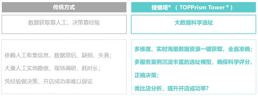 棱镜数聚(北京)信息技术有限公司研发的“棱镜塔 ®(TOPPrism Tower®)数字化赋能平台”融合丰富完善的外部大数据和企业数据,运用机器学习,AI算法及统计学理论,结合行业化深度定制,以高精准、短周期、低成本、可视化的优势为品牌商规划选址提供完美的解决方案。