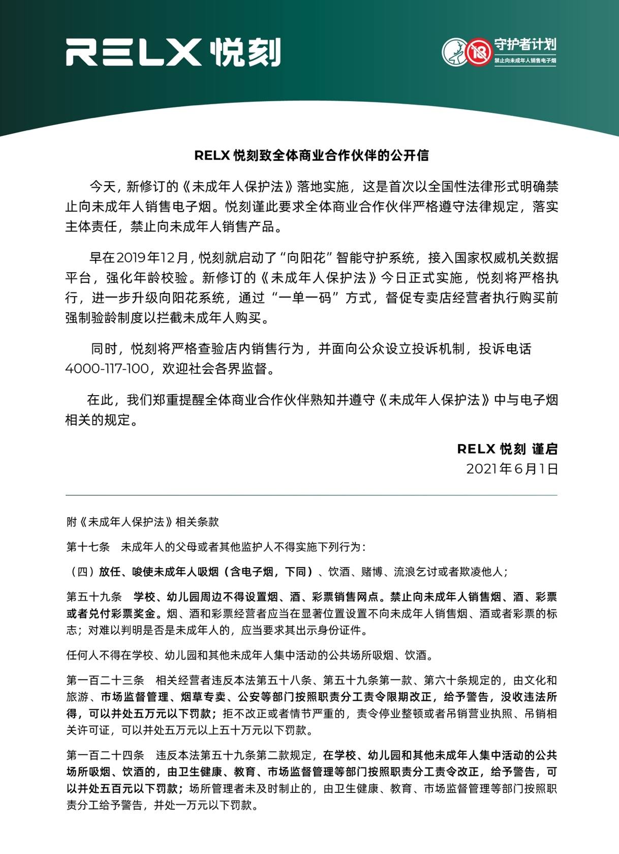 6月1日,RELX悦刻发布《致全体商业合作伙伴的公开信》,要求包括悦刻专卖店主、店员、经销商在内的所有商业合作伙伴,严格遵守法律规定,禁止向未成年人销售产品。