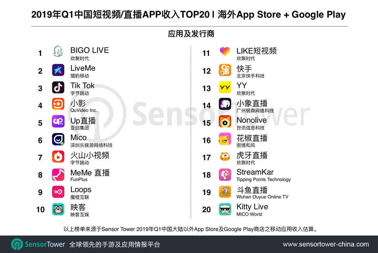 2019年Q1中国短视频/直播APP海外收入榜来源:Sensor Tower