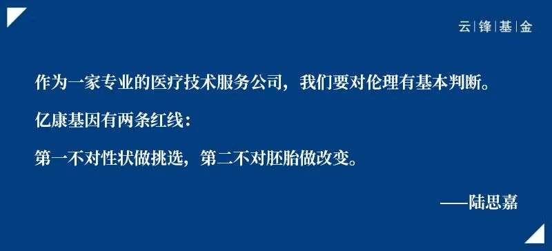 作为一家专业的医疗技术服务公司,要对伦理有基本的判断。我们有两条红线:第一是只做跟疾病相关的胚胎挑选,第二是我们不做改变。男方精子和女方卵子形成一系列胚胎,这些胚胎都是大自然形成的,我们选择没有疾病的胚胎做移植,有疾病的胚胎就放弃移植,但绝对不会对它进行改造。