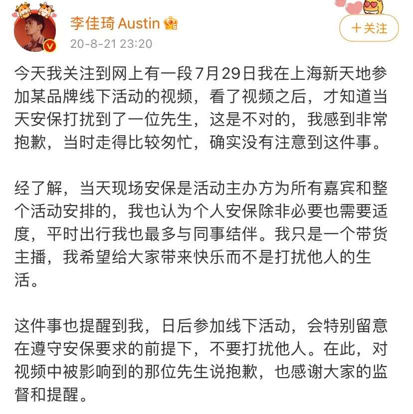 比如他的定位更像个明星了。2019年刚火时,他说自己不是明星,上街会随身带十几根口红以便有粉丝认出他时送给对方,2020年他上街,却出现了“李佳琦保安推人事件”。