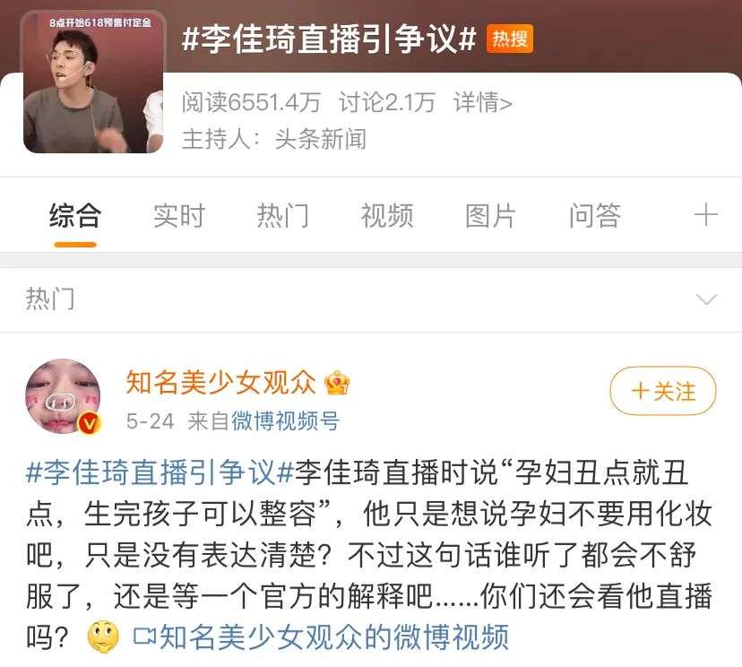 李佳琦最近一次“惹众怒”是在他的“618”直播间,他推销商品时被网友问到孕妇能否使用,心直口快地说:“我直播间618没办法给孕妈妈推荐商业品牌,孕妈妈怀孕的时候,我们丑一点就丑一点,等你怀完宝宝了,让老公带你去整容,给你出做脸的钱,买化妆品。”