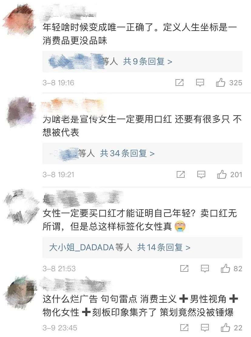 为什么抹了口红才是女生?为什么面向女生的广告片却要站在男性视角?有网友对该片这样评价:“消费主义+男性视角+物化女性+刻板印象集齐了,策划竟然没被锤爆”。