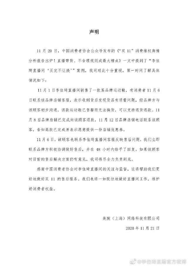 甚至他的专业度都有在被质疑。直播带货的大闸蟹、美容仪都因疑似虚假宣传上过热搜,“运动鞋买完不让换”更是让李佳琦直接被中消协点名,随后他的直播间站出来予以回应、做了后续处理。