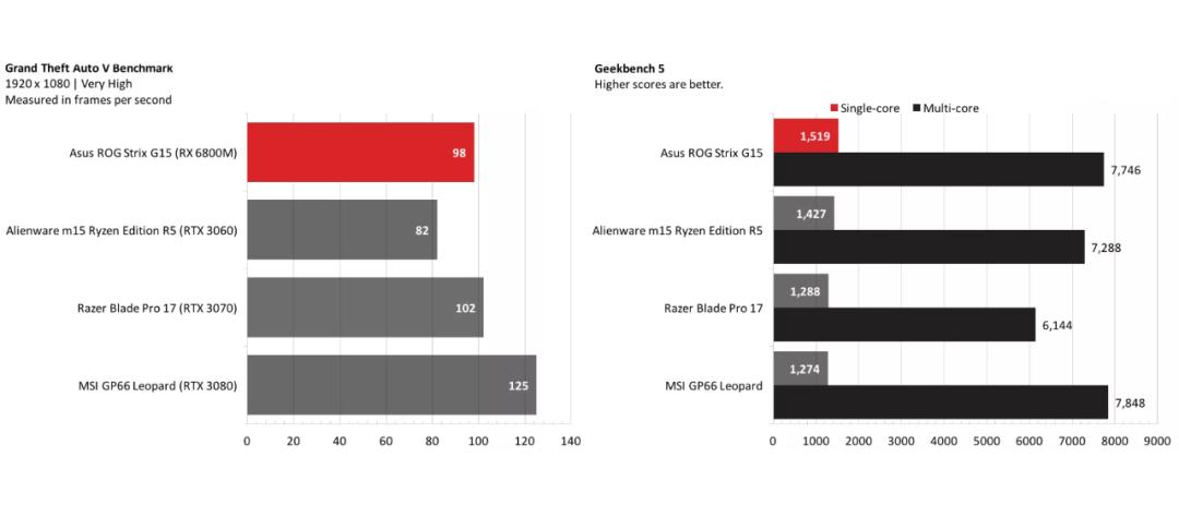 不过在Tom's Hardware最新的评测中,虽然采用了Advantage设计的华硕的败家之眼G15(6800M)在Geekbench5上的跑分略胜一筹,实际游戏中的表现却不如RTX3070,最多只能打平。