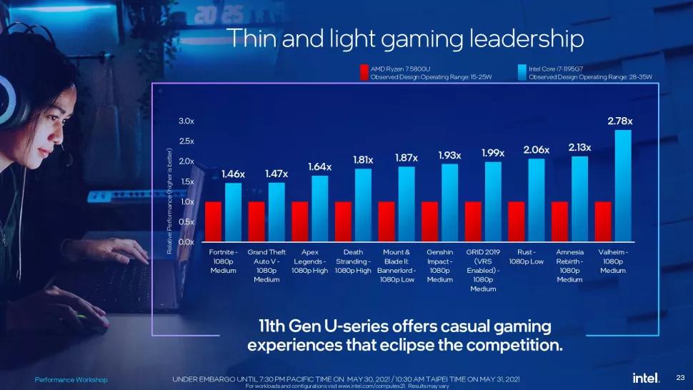 可以从英特尔给的图表中看到,视频处理性能是AMD 5800U的1.9倍左右,Handbreak 视频更是达到了AMD的8倍性能。