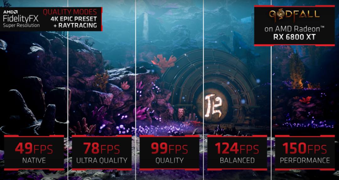 从PPT大厂AMD一贯的作风来看,这次的FSR前景并不太明朗。从下图这个演示上看,似乎并没有使用FSR,有的只是一个写着性能数据的酷炫背景。