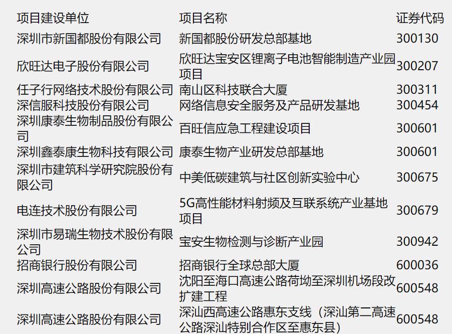 此外,多家上市公司的高科技建设项目入围也吸引了市场的关注,包括深圳市三利谱光电科技股份有限公司(三利谱,002876.SZ)建设的超宽幅2520mm偏光片生产线项目、深圳顺络电子股份有限公司(顺络电子,002138.SZ)参与的新型电子元器件研发制造基地项目和电连技术股份有限公司(电连技术,300679.SZ)建设的5G高性能材料射频及互联系统产业基地项目。