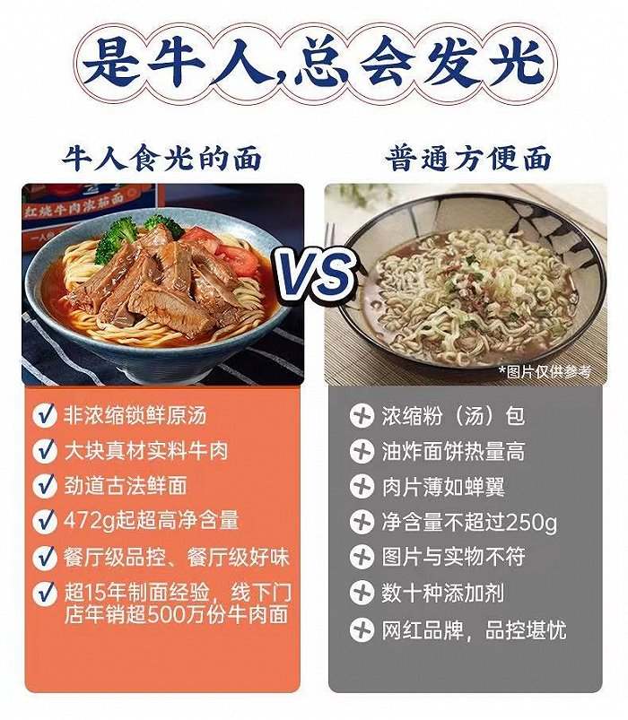 界面新闻发现,该品牌在天猫平台开设了单独的“牛人食光旗舰店”。鲜煮面产品包括红烧牛肉浓茄面、叉烧豚骨浓汤面、肥牛金汤酸口面、藤椒牛肉麻辣面4种口味,单盒平均价格超过30元。它最大的卖点在于,配料包里含有大块肉以及非浓缩原汤,面条需要现煮,适合一人食的消费场景。