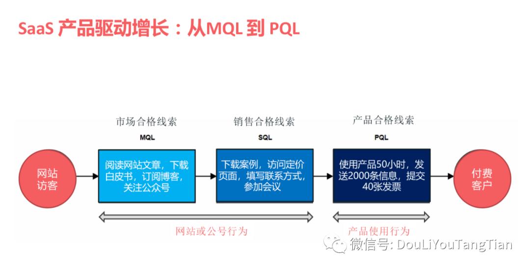 当我们觉得基于你的产品使用量,我们推测你对我们的产品很喜欢,看到了价值;同时,你所在的公司是一个比较大的公司,那我就认为你是一个销售线索,销售应该去跟进。所以PQL是根据产品的使用行为,去把用户确定为一个潜在的销售线索。那这个时候,把你转化为一个付费的客户,其实相对而言是更容易的。