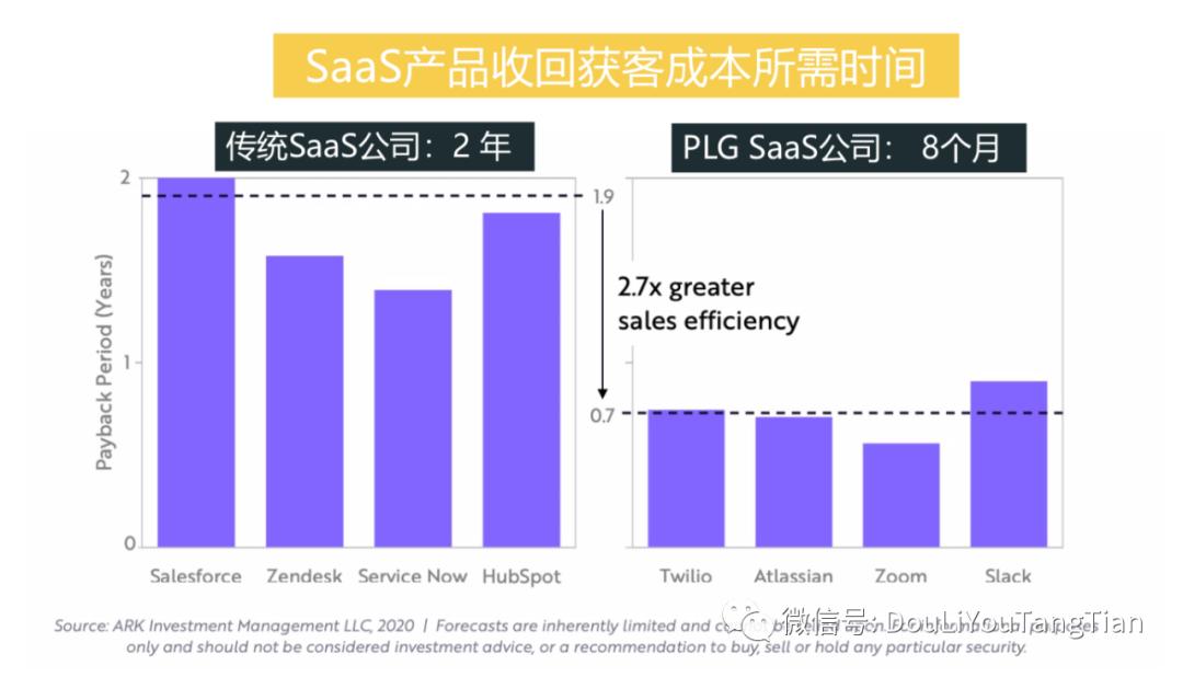 下面这个图是一家基金公司叫 ARK,这家基金公司非常看好 SaaS 这个赛道,就做了一个SaaS 公司的研究报告,比较了传统的SaaS公和一些新型的基于产品增长并具有自传播特性的SaaS 公司,收回获客成本的时间。