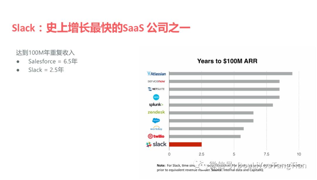 Slack是历史上增长最快的 SaaS 公司之一,一般来说,对于一个 SaaS 公司最开始零收入达到一亿美金年重复收入是个非常重要的里程碑。绝大多数公司可能都要都需要五年七年以上的时间,但是 slack 只用了两年半的时间,它的增长是非常快的,那其实是因为这个产品有很多特殊之处,它是通信软件,其实本身就有很多社交产品的基因在。