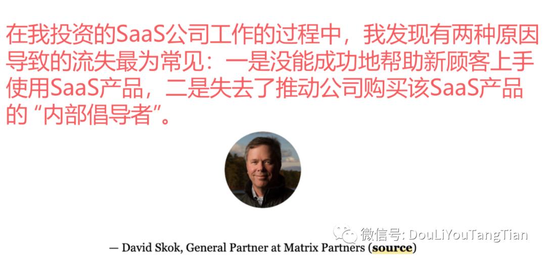 David Skok是非常早期的一位SaaS 的产品的投资人,也很有名。他就说我在投资 SaaS 产品的时候,就会发现有两种情况是最容易导致用户流失,一种就是没能够成功地帮助新顾客上手来使用,最开始的时候产品根本就没用起来,那过一段时间自然而然就流失掉了。