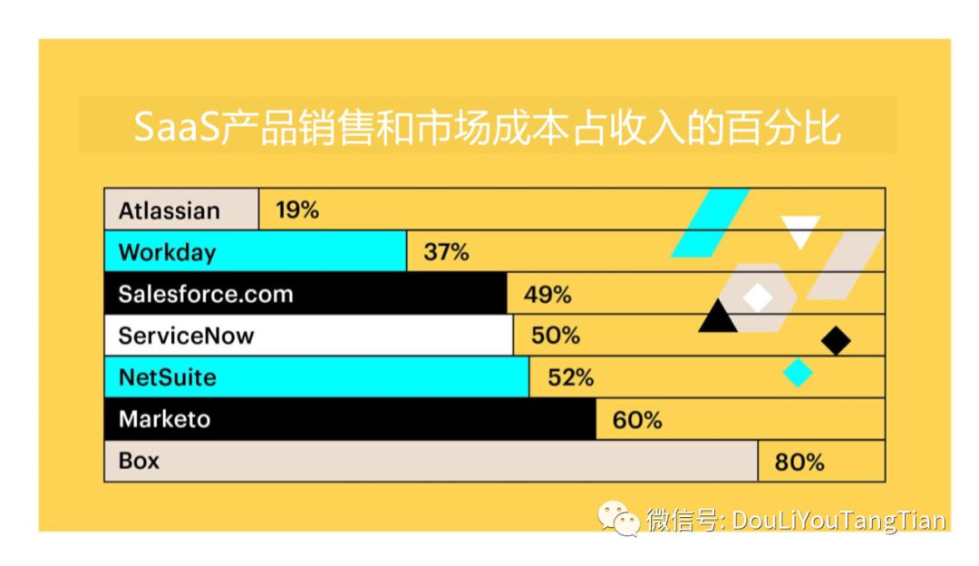 下图列出了一些 SaaS 产品,他们的销售和市场成本占整个营收的百分比,这在SaaS 公司里是一个非常重要的指标,它代表着获客效率有多高。可以看到,Atlassian 在几年前的销售和市场成本只占收入的19%,而其他的一些SaaS 公司是将近约 50%。当你可以只花这么少的钱就能够获得用户的时候,就可以把更多的钱放到你的研发上,进一步地去加强你的产品,这是非常大的优势。