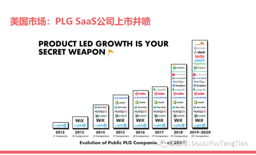 在过去的几年里面,在美国市场上。基于 PLG 这样的一种增长模式的 SaaS 公司出现的频率越来越高,上市的数量也越来越多,2019 年到 2020 年的时候有 21 家公司上都在报告中提到了采取产品驱动增长的模式,这些公司都想要强调这是他们的一个卖点,可以带来比较高的销售效率比较低的获客成本。