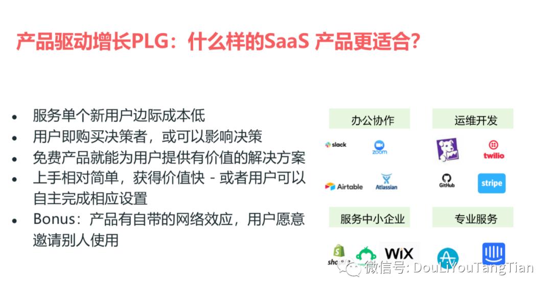 PLG不适合所有的SaaS产品,它要求边际成本低,上手快,并且终端用户能影响购买决策。最常见的四类PLG 产品是办公协作,运维开发, 针对中小企业的产品,以及专业服务产品。