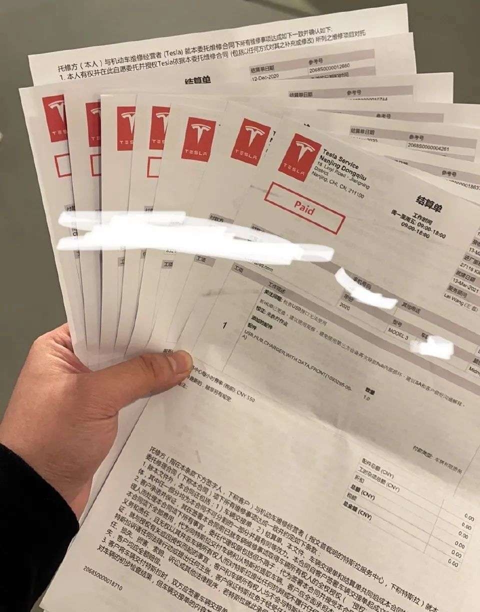 第二点就是售后极其不专业。据张先生介绍,在一系列维修之后,特斯拉并不愿意提供维修单,为此他在店里“闹”了足足三个小时。而拿到维修单后,他发现其中漏洞百出,很多故障以及更换的零部件都没被写入维修单。张先生对特斯拉的信任彻底被打破,他也自此养成了“与特斯拉沟通必录音”的习惯。