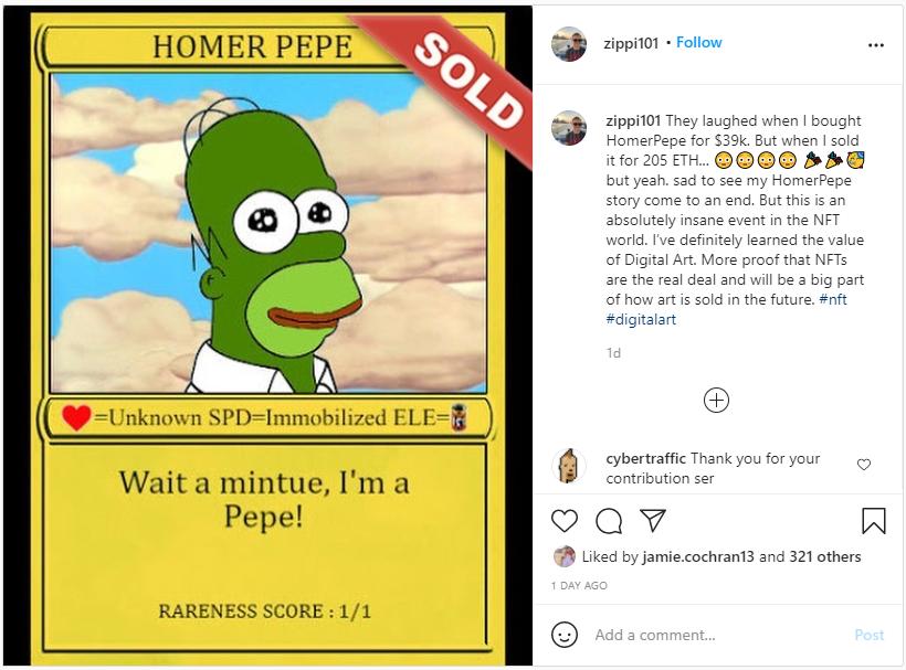 “Homer Pepe”2021年3月以205 ETH(约32万美元)的价格售出