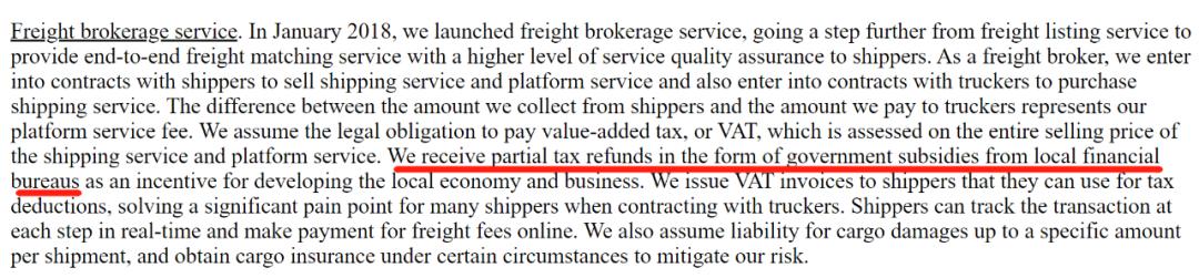值得一提的是,货运经纪服务是满帮集团的营收支柱,2019-2020年占比均高达五成以上。有业内专家向BT财经反映,该项服务的核心收入并非货主与司机的费用差价,而是来自于地方政府的退税。满帮在招股书中也确实提及了地方政府会“以政府补贴的形式给予部分退税”,还表示会“给发货人开具增值税发票,让他们用来抵扣税款”。
