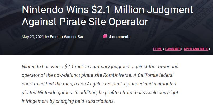 近日,任天堂在对盗版网站RomUniverse侵权一案获得胜诉,目前该盗版网站已经关闭,运营者还需要向任天堂赔偿211.5万美元。