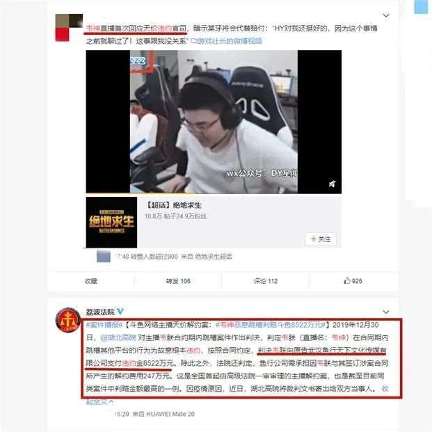 2019年年底,关于违约案,法院一审判决韦神支付斗鱼索要的赔偿8522万元,然而事情突然有了反转。