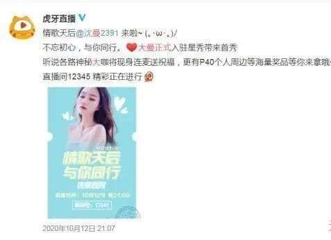 2020年底,年入百万、红的发紫的YY平台知名主播沈曼在合同期间违约出走,在虎牙进行直播首秀。
