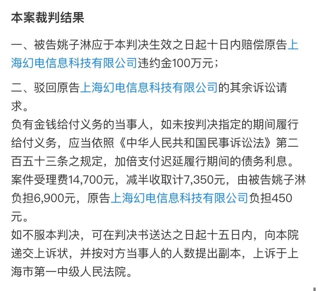 判决结果为被告姚子淋应于本判决生效之日起十日内赔偿原告上海幻电信息科技有限公司违约金100万元等。