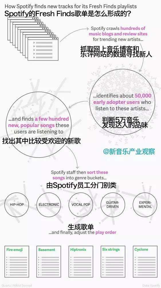 Fresh Finds的特别之处在于,它不仅仅只靠算法推荐,而是算法基于KOL推荐的再分配。2016年,Fresh Finds推出的时候,Spotify声称,算法是基于5万个音乐博主的推荐来进行分配。