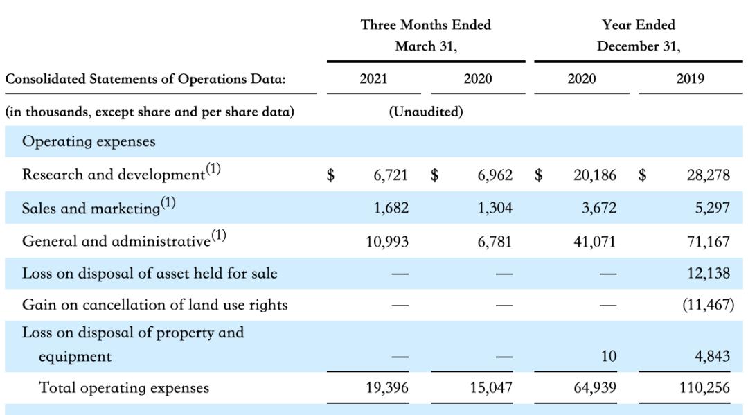 搭建线上线下销售网络,加速了FF的资金消耗,2021年一季度,FF营销费用达到168.2万美元、管理费用达到1099.3亿美元,均超过2020年全年的费用。