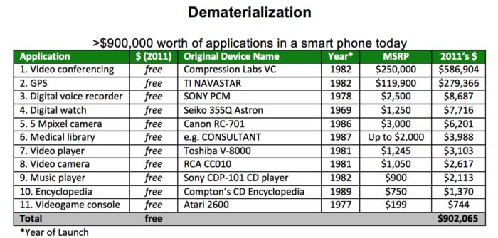这张来自Diamandis的作品《富足》(Abundance)的图表显示了我们是如何在1969年到1989年间让价值90万美元的产品和服务快速“贬值”的。