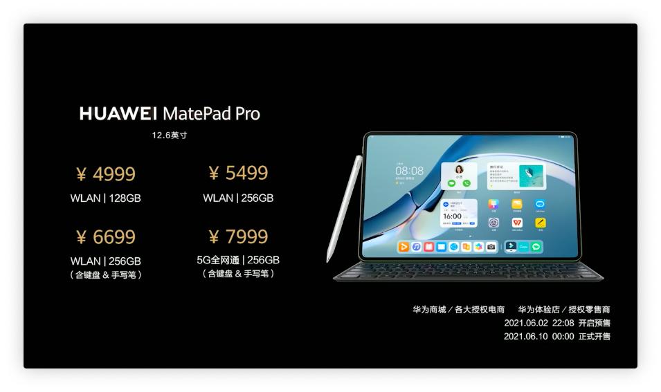 售价方面,华为MatePad Pro 12.6有夏日胡杨、冰霜银和曜石灰三款配色,提供WLAN 128GB/WLAN 256GB/WLAN 256GB手写笔键盘套装/5G全网通256GB键盘手写笔套装四个版本,售价分别为4999/5499/6699/7999元,6月2日开启预售,10日零点正式开售。