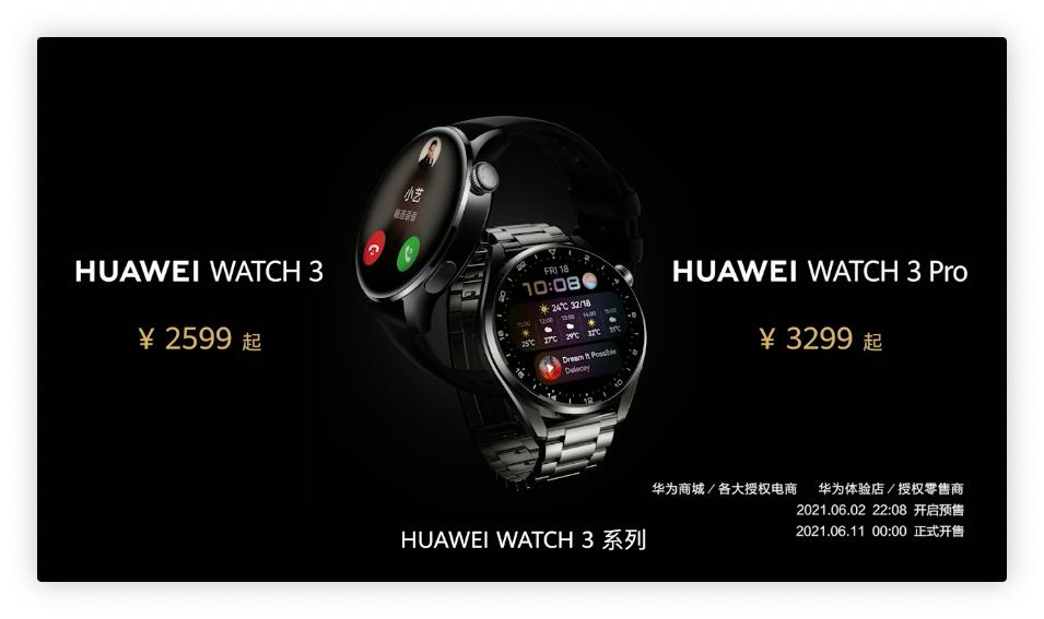 售价方面,华为Watch 3/Watch 3 Pro售价分别从2599/3299元起,6月2日开启预售,6月11日正式开售。