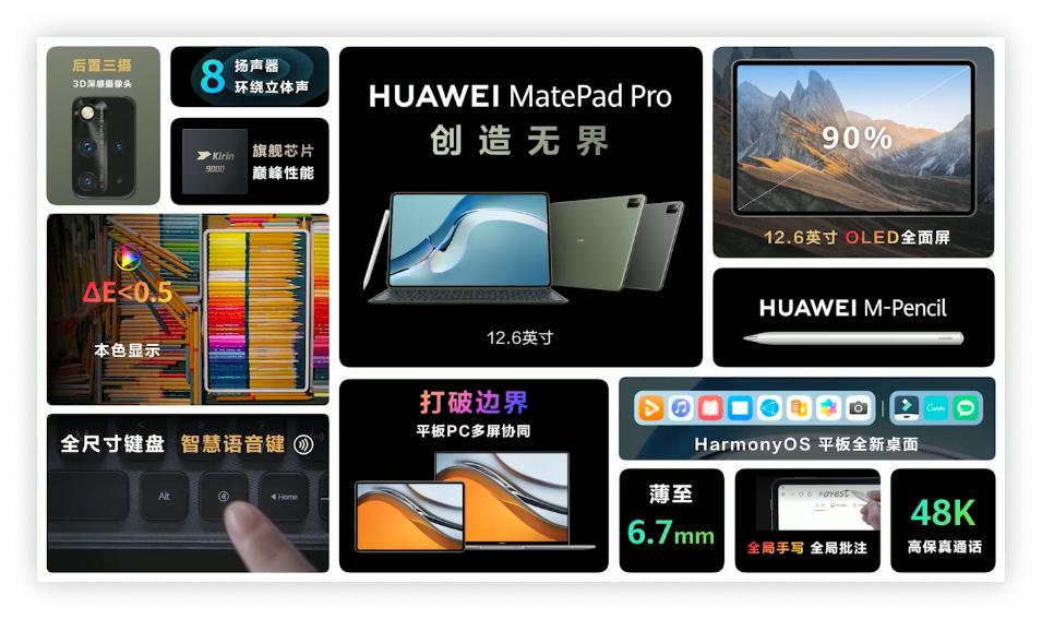 除了华为Watch 3,全新的HarmonyOS 2.0也来到了平板电脑上。此次华为共发布了三款搭载HarmonyOS 2.0的平板电脑,分别为MatePad Pro 12.6、MatePad Pro 10.8与数字系列的MatePad 11。其中华为MatePad 12.6是采用了HarmonyOS 2.0的全新旗舰产品,搭载了一块12.6英寸OLED屏幕,分辨率为2560×1600像素,像素密度高达240PPI。硬件方面,MatePad Pro 12.6采用了麒麟9000系列芯片,搭配8GB内存与128/256GB存储空间,NM存储卡最高可以提供256GB扩充容量。