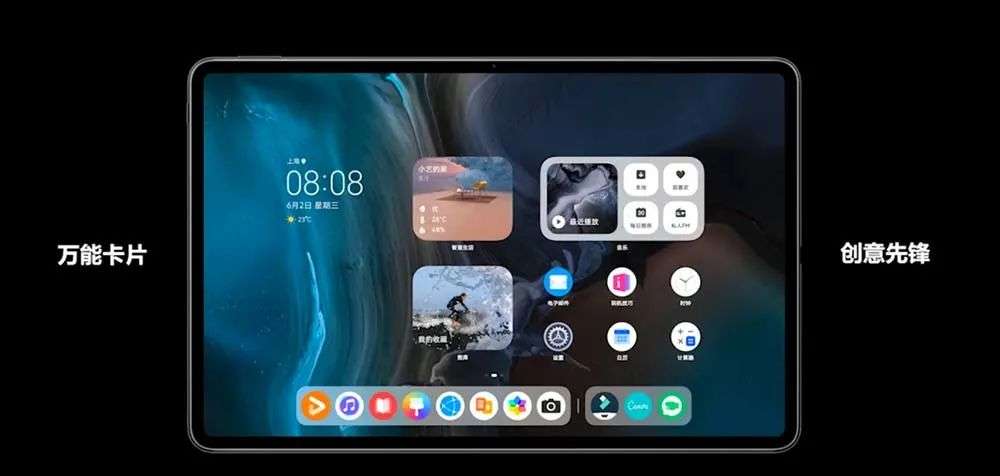 屏幕之外,鸿蒙OS当然是MatePad Pro最核心的变化,与手机上的鸿蒙OS类似,MatePad Pro的桌面上也有“万能卡片”,同时“大文件夹”里的APP可以直接点击打开,减少了跳转层级。