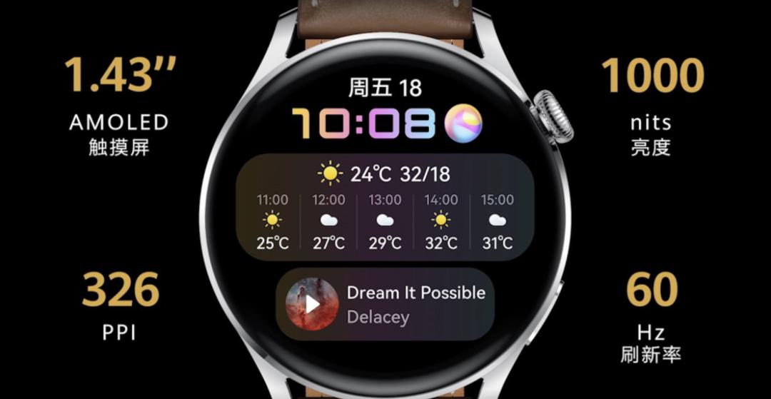 在硬件配置方面,华为Watch 3 Pro搭载了一块1.43英寸OLED屏幕,屏幕PPI为326,机身采用钛合金打造,表面为蓝宝石材质。