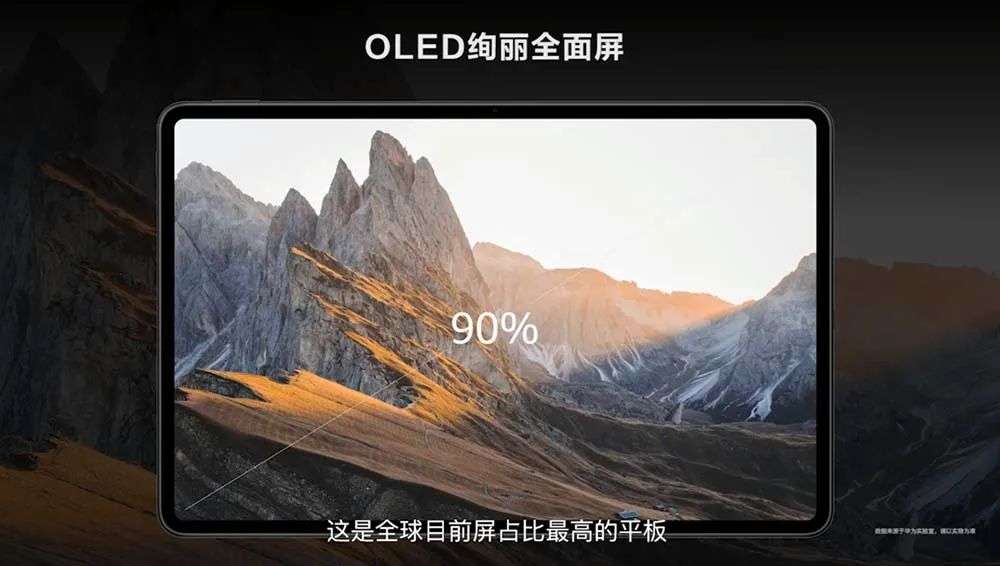 首先作为一款平板电脑,最突出直观的就是其屏幕。MatePad Pro搭载了一块12.6英寸的OLED屏幕,其屏占比达到了90%,边框仅为5.6mm,正面观感非常具有视觉冲击力,据称也是目前全球屏占比最高的平板电脑。