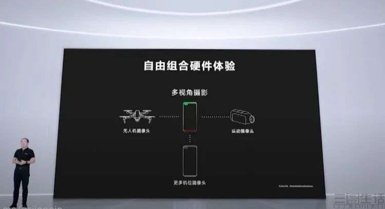 首先,通过鸿蒙OS的模块化架构,不同形态的设备之间可以实现一些特定功能的打通。例如今天刚刚发布、搭载HarmonyOS 2的Watch 3系列智能手表,就可以访问华为智能手机的摄像头,在手表的屏幕上控制手机拍照。不仅如此,华为智能电视、智能手机、平板,甚至是一些合作伙伴的无人机摄像头也可以像这样相互“借用”,甚至还能够实现多个不同设备从不同角度同步拍摄。