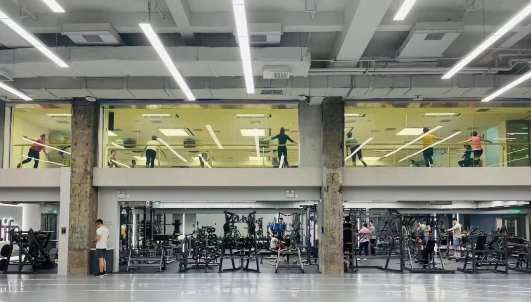 在网友点评里,健身房的7米挑空也是被提到的亮点,是团体课、搭配街头篮球场、搏击的空间。但其实这曾是能量城市重塑设计时的痛点,这里曾经是夜店客的舞池,楼上环绕着看台,这就代表着旧空间有违传统健身房器械、跑步、团体课分区的设计思维。
