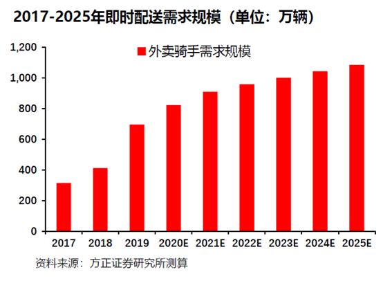 据方正证券研究所数据,2019年我国外卖用户数达到4.2亿人,即时配送人员超800万人,由于城市受“禁摩令”的影响,配送主要靠电动车来完成,巨大的业务需求量将推动电动摩托车销量实现快速增长。