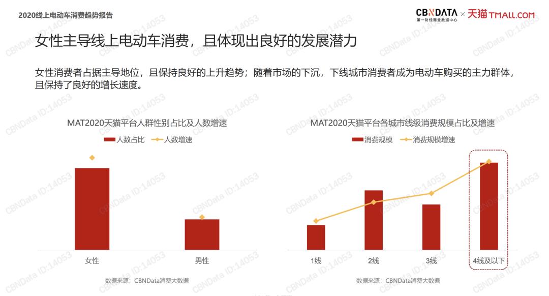 据天猫2020年发布的电动车消费趋势报告,四线及以下城市女性消费者成为电动车购买的主力群体, 并且保持了良好的增长速度。[2]