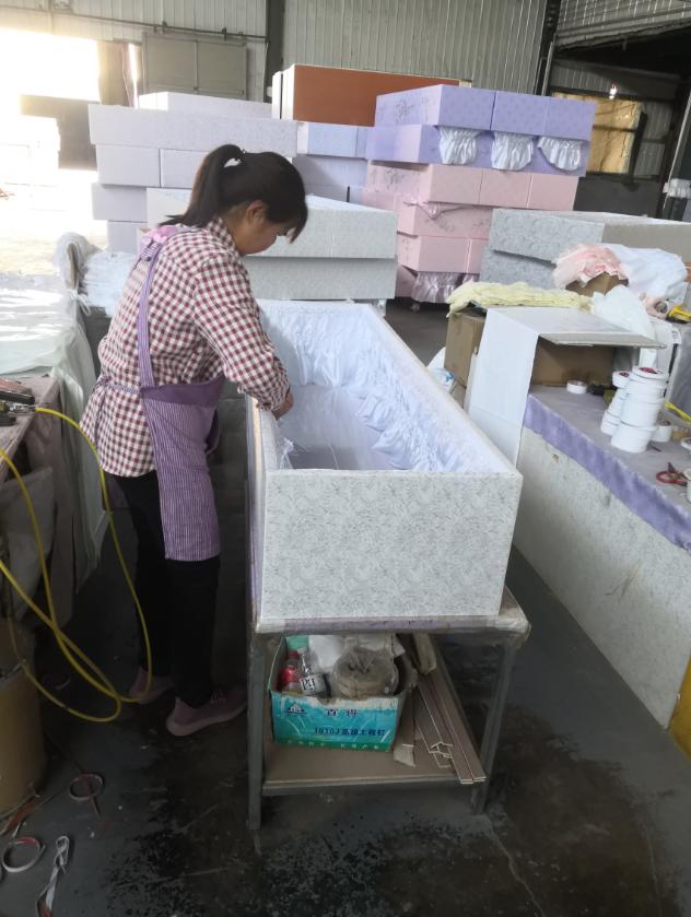打框架、压机、组箱体、包布、钉底板,工人们井然有序地忙着手头的活儿,一具具棺材逐步成型。制作完成经检验后,这些棺材将出口到日本。