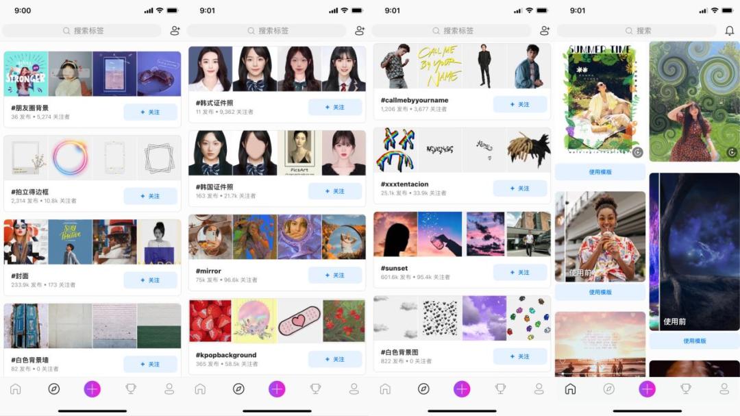 因为笔者是使用中国区应用商店下载的 PicsArt 且定位在中国,因此 PicsArt 给笔者推送的第一个话题是#朋友圈背景。