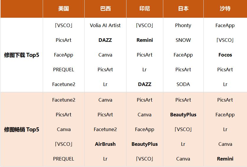 笔者在美国、巴西、印尼、日本以及沙特阿拉伯等 5 个热门市场的 iOS 摄影与录像榜单中,选取了 Top5 修图 App 进行统计制成了上表。