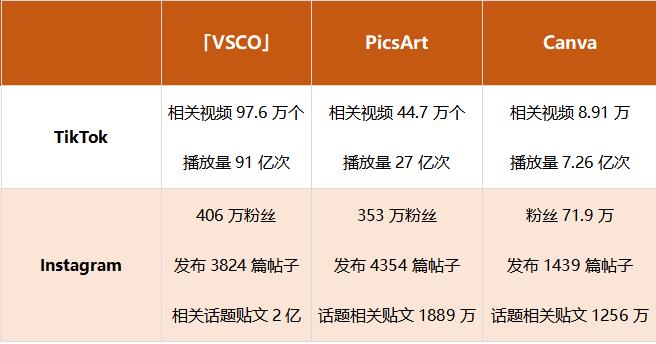 根据 Tikstar 数据,在 TikTok 上,共有 97.63 万个视频以「VSCO」为标签,并累计产生了 91 亿次播放。一直以来,「VSCO」都是 TikTok 上的热门标签,根据 MediaKix 统计数据,「VSCO」位列 2019 年 TikTok Top100 热门标签榜第 49、VSCOcam 位列第 65。